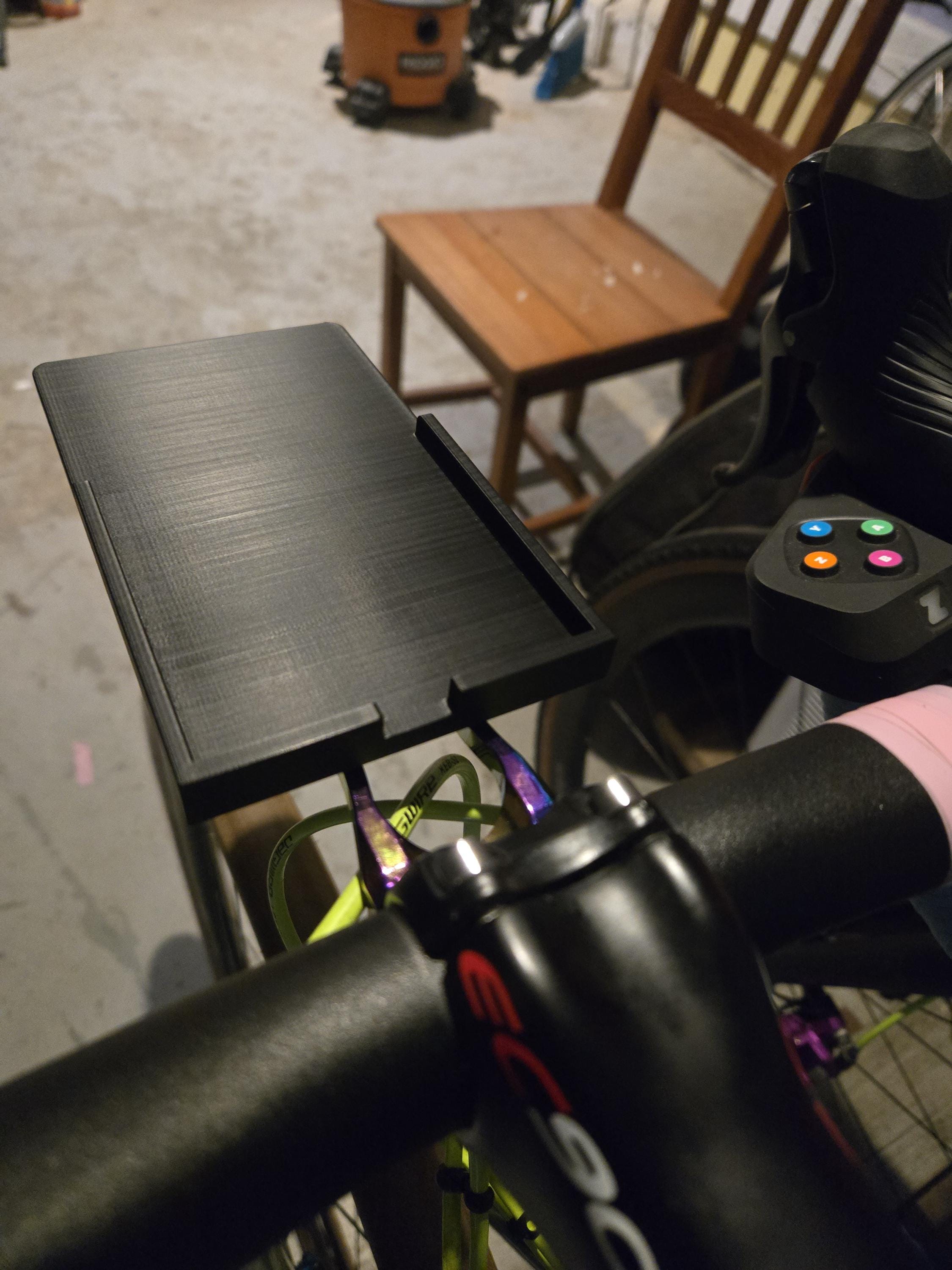 This 3D printed tray is designed to hold your phone, power bar, or any other small items you may want during your ride. There is a small gap for a charger to flow through, so you can charge your phone while riding. This is for your stationary cycling time and should be removed when riding outdoors. It is not meant to support heavy weights. It fits into the modern Garmin GPS biking mount.